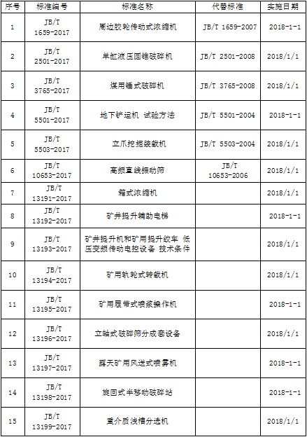 2017年4月12日,工業和信息化部第14號公告批準了652項行業,其中由礦山機械化技術委員會歸口的有15項,由機械工業出版社出版,具體如下。