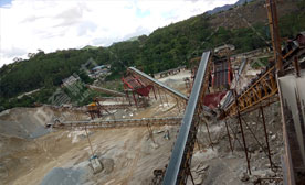 石料生產線中大塊石料經料倉由振動給料機均勻地送進錘式破碎機進行粗碎,粗碎后的石料由皮帶輸送機送到反擊式破碎機進行進一步破碎;細碎后的石料由皮帶輸送機送進振動篩進行篩分,篩分出幾種不同規格的石子,滿足粒度要求的石子由成品皮帶輸送機送往成品料堆;不滿足粒度要求的石子由皮帶輸送機返料送到反擊式破碎機進行再次破碎,形成閉路多次循環。成品粒度可按照用戶的需求進行組合和分級,為保護環境,可配備輔助的除塵設備。