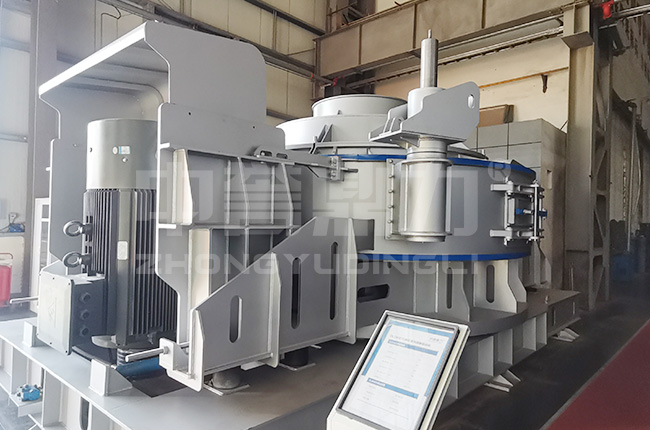 塊狀礦石由進料斗落入上破碎腔內上甩料盤上,借助甩料盤的離心力將物料拋向筒體的內壁,與安裝在內壁上的反擊板猛烈碰撞,同時物料互相撞擊,使之破碎或產生大量發絲裂紋,接著物料進入錐形轉子腔后,在錐形空間呈螺旋狀下落,經沖壓、擠壓,使已有裂紋的礦石進一步被破碎。由于錐形轉子與襯板間的斜度,促使較小的物料向下遷移,達到由大到小自動實現分級破碎。